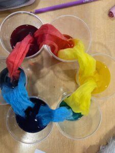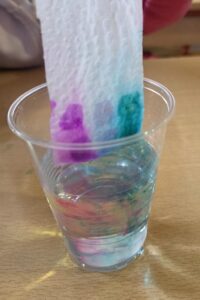 - dobivanje duginih boja na papirnatom ubrusu pomoću flomastera i vode,